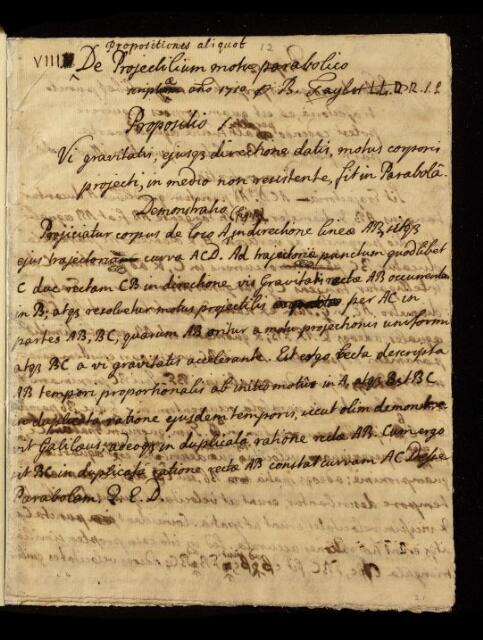 Brook Taylor, Paper, 'De propositiones aliquot de projectilium motu parabolico scriptae anno 1710' ['Some proposals on parabolic motion of projectiles written in the year 1710'] by B [Brook?] Taylor, 1710, CLP/3ii/12, The Royal Society Archives, London, https://makingscience.royalsociety.org/items/clp_3ii_12/paper-de-propositiones-aliquot-de-projectilium-motu-parabolico-scriptae-anno-1710-some-proposals-on-parabolic-motion-of-projectiles-written-in-the-year-1710-by-b-brook-taylor, accessed on 08 February 2026