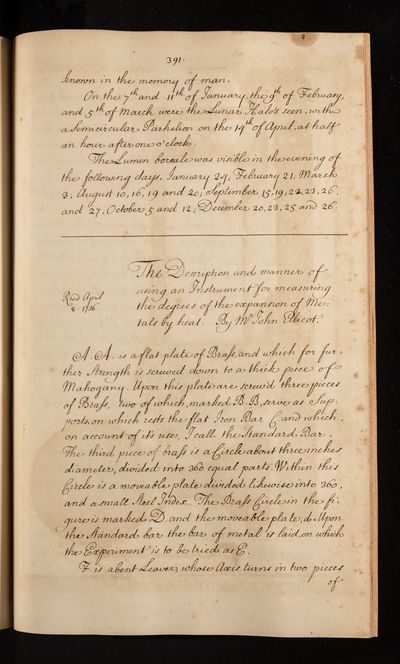 Paper, 'Description and manner of using an instrument for measuring the degrees of the expansion of metalls by heat' by John Ellicot