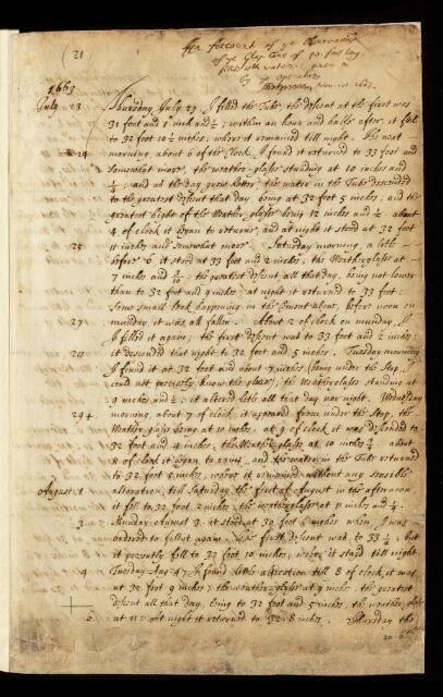 Paper, 'An account of the observations of the glas-cane of 40 foot long filled with water given in by the operator' by unknown author, 18 November 1663, CLP/4i/8, The Royal Society Archives, London, https://makingscience.royalsociety.org/items/clp_4i_8/paper-an-account-of-the-observations-of-the-glas-cane-of-40-foot-long-filled-with-water-given-in-by-the-operator-by-unknown-author, accessed on 21 January 2026