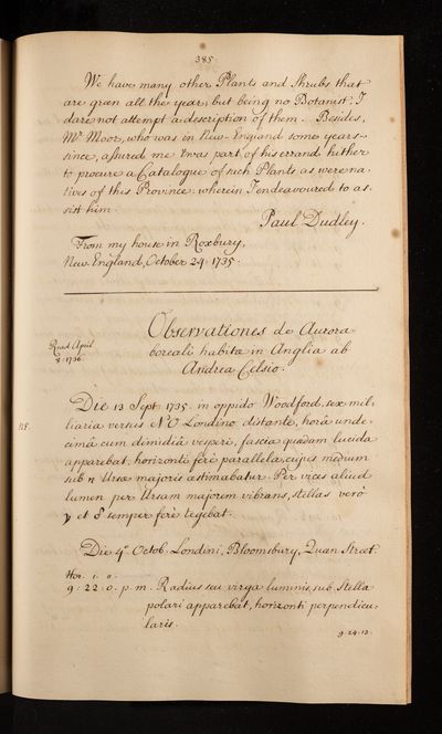 Andreas Celsius, Paper, 'Observationes de aurora boreali habita in Anglia' [Observations on an auroroa borealis in England] by Andreas Celsius, 08 April 1736, CLP/4ii/20, The Royal Society Archives, London, https://makingscience.royalsociety.org/items/clp_4ii_20/paper-observationes-de-aurora-boreali-habita-in-anglia-observations-on-an-auroroa-borealis-in-england-by-andreas-celsius, accessed on 10 December 2025