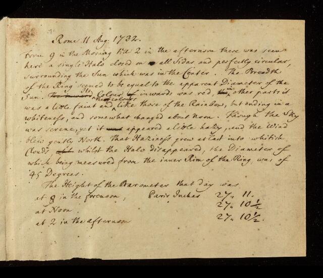 Paper, observations of a halo surrounding the sun by unknown author, 11 August 1732, CLP/4ii/7, The Royal Society Archives, London, https://makingscience.royalsociety.org/items/clp_4ii_7/paper-observations-of-a-halo-surrounding-the-sun-by-unknown-author, accessed on 17 January 2026