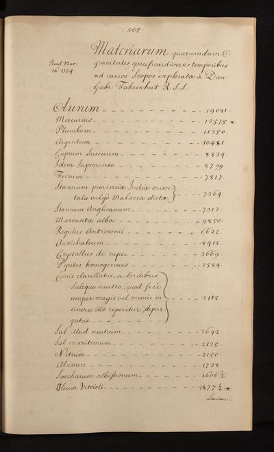 Paper 'Materiarum quarundam gravitates specficæ' [Concerning the gravity of different substances] by D G [Daniel Gabriel] Fahrenheit, 26 March 1724, CLP/6/69b, The Royal Society Archives, London, https://makingscience.royalsociety.org/items/clp_6_69b/paper-materiarum-quarundam-gravitates-specficæ-concerning-the-gravity-of-different-substances-by-d-g-daniel-gabriel-fahrenheit, accessed on 15 March 2026