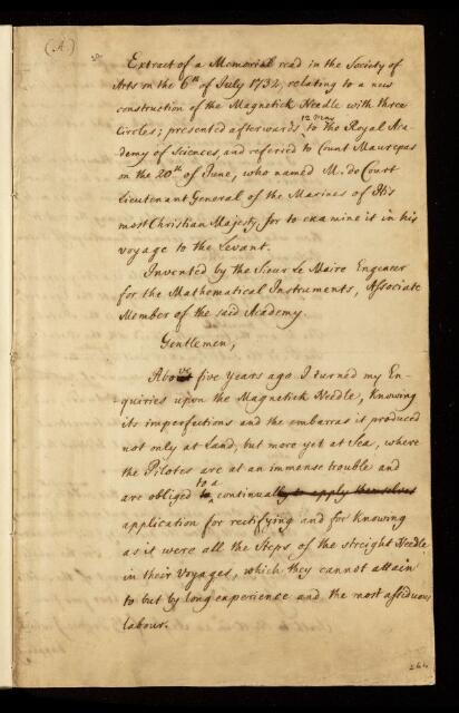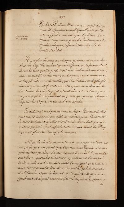 Extract from the memoir read which had been presented at the Royal Academy of Sciences on 12 May 1732, and referred to Count Maurepas [Jean-Frédéric Phélypeaux] on 20 June, who requested that M de Court, Lieutenant General of the Marines examine it on his voyage to the Levant [Middle East]. This particular magnetic needle was invented by the Sieur Le Maire Engineer for the Mathematical Instrument. The extract includes a series of experiments performed with the new needle and a list of individuals who tried the compass experiment abroad.