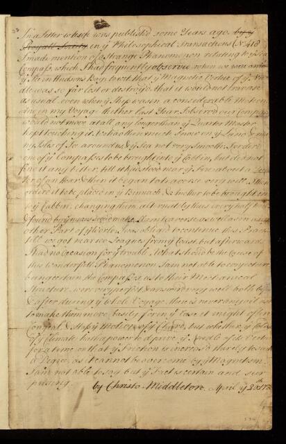 Christopher Middleton, Paper, 'Of the magnetic needle affeced by cold' by Christopher Middleton, 20 April 1738, CLP/9ii/32, The Royal Society Archives, London, https://makingscience.royalsociety.org/items/clp_9ii_32/paper-of-the-magnetic-needle-affeced-by-cold-by-christopher-middleton, accessed on 12 December 2025