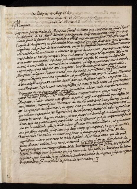 Ismael Bullialdus, Letter, from Ismael Boulliaud to Henry Oldenburg, dated at Paris, 16 May 1667, EL/B1/122, The Royal Society Archives, London, https://makingscience.royalsociety.org/items/el_b1_122/letter-from-ismael-boulliaud-to-henry-oldenburg-dated-at-paris, accessed on 13 November 2025