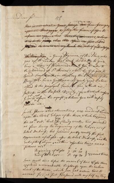 Autograph letter concerning observations of a total eclipse of the moon in October 1724