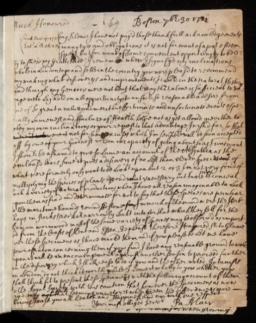 Patrick Blair, Patrick Blair, Letter, from Patrick Blair to Hans Sloane, dated at Boston, 30 November 1721, EL/B2/69, The Royal Society Archives, London, https://makingscience.royalsociety.org/items/el_b2_69/letter-from-patrick-blair-to-hans-sloane-dated-at-boston, accessed on 14 November 2025
