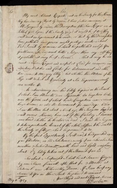 William Barlow, Letter, from William Barlow to William Rutty, 11 May 1729, EL/B3/14, The Royal Society Archives, London, https://makingscience.royalsociety.org/items/el_b3_14/letter-from-william-barlow-to-william-rutty, accessed on 07 February 2026
