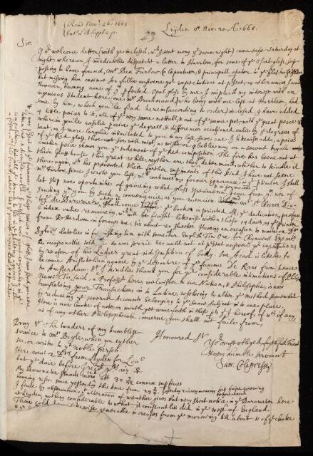 Samuel Colepresse, Letter, from Samuel Colepresse to Henry Oldenburg, dated at Leyden, 20 November 1668, EL/C1/23, The Royal Society Archives, London, https://makingscience.royalsociety.org/items/el_c1_23/letter-from-samuel-colepresse-to-henry-oldenburg-dated-at-leyden, accessed on 15 February 2026