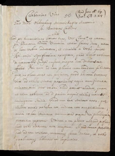 Jean Dominique Cassini, Jean Dominique Cassini, Letter, from Jean Dominique Cassini to Henry Oldenburg, dated at Paris, 10 June 1669, EL/C1/50, The Royal Society Archives, London, https://makingscience.royalsociety.org/items/el_c1_50/letter-from-jean-dominique-cassini-to-henry-oldenburg-dated-at-paris, accessed on 12 February 2026