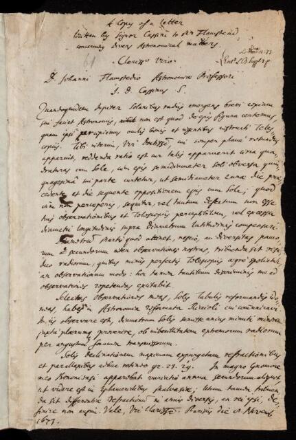 Jean Dominique Cassini, Jean Dominique Cassini, Copy of a letter, from Jean Dominique Cassini to John Flamsteed, dated at Paris, 08 November 1673, EL/C1/61, The Royal Society Archives, London, https://makingscience.royalsociety.org/items/el_c1_61/copy-of-a-letter-from-jean-dominique-cassini-to-john-flamsteed-dated-at-paris, accessed on 17 January 2026