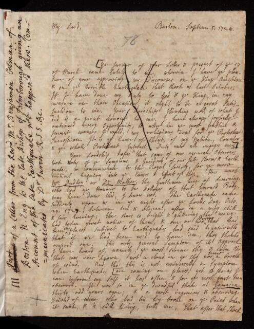 III. Part of a letter from the Reverend Mr. Benjamin Colman, of Boston in New England, to the late Bishop of Peterborough; giving an account of the late earthquake which happened there. Communicated by Dr. Jurin. R. S. S. &c External link, opens in new tab.