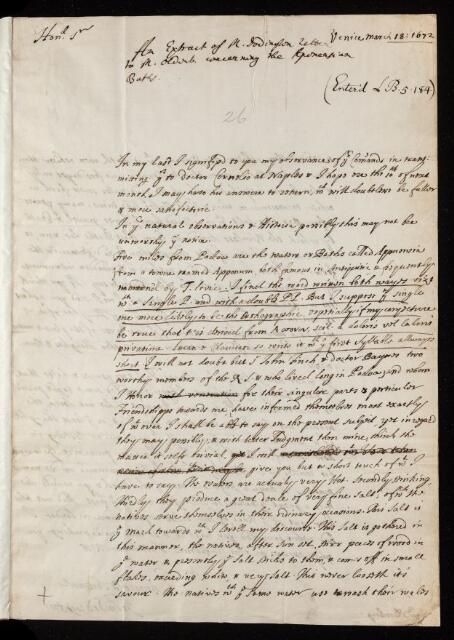 John Dodington, Letter, from John Dodington to Henry Oldenburg, dated at Venice, 18 March 1672, EL/D1/26, The Royal Society Archives, London, https://makingscience.royalsociety.org/items/el_d1_26/letter-from-john-dodington-to-henry-oldenburg-dated-at-venice, accessed on 16 March 2026