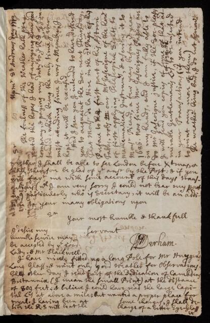 William Derham, William Derham, Letter, from William Derham to Richard Waller, dated at Upminster, 30 November 1713, EL/D1/60, The Royal Society Archives, London, https://makingscience.royalsociety.org/items/el_d1_60/letter-from-william-derham-to-richard-waller-dated-at-upminster, accessed on 07 December 2025