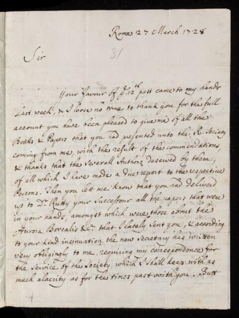 Thomas Dereham, Thomas Dereham, Letter, from Thomas Dereham to James Jurin, dated at Rome, 27 March 1728, EL/D2/31, The Royal Society Archives, London, https://makingscience.royalsociety.org/items/el_d2_31/letter-from-thomas-dereham-to-james-jurin-dated-at-rome, accessed on 08 March 2026