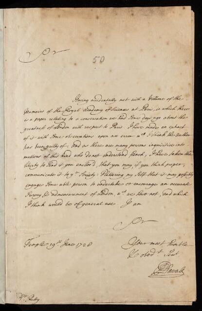 Peter Davall, Peter Davall, Letter, from Peter Davall to William Rutty, dated at Temple, 19 June 1728, EL/D2/50, The Royal Society Archives, London, https://makingscience.royalsociety.org/items/el_d2_50/letter-from-peter-davall-to-william-rutty-dated-at-temple, accessed on 15 February 2026