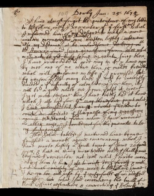 John Flamsteed, John Flamsteed, John (1646-1719), Letter, from John Flamsteed to Henry Oldenburg, dated at Derby, 25 January 1674, EL/F1/109, The Royal Society Archives, London, https://makingscience.royalsociety.org/items/el_f1_109/letter-from-john-flamsteed-to-henry-oldenburg-dated-at-derby, accessed on 12 February 2026