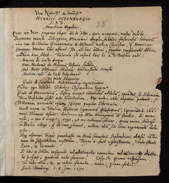 Martin Fogel, Letter, from Martin Fogel to Henry Oldenburg, dated at Hamburg, 08 January 1670, EL/F1/28, The Royal Society Archives, London, https://makingscience.royalsociety.org/items/el_f1_28/letter-from-martin-fogel-to-henry-oldenburg-dated-at-hamburg, accessed on 08 March 2026