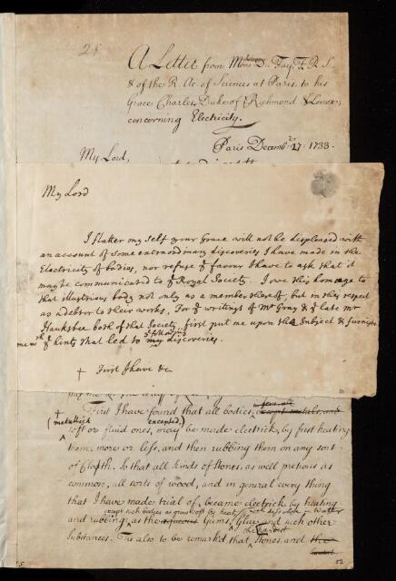 Charles Francois de Cisternay Du Fay, Charles Francois de Cisternay du Fay, Translation of a letter, from [Charles Francois de Cisternay] Du Fay to Charles the Duke of Richmond and Lenox , dated at Paris, 01 January 1733, EL/F2/21, The Royal Society Archives, London, https://makingscience.royalsociety.org/items/el_f2_21/translation-of-a-letter-from-charles-francois-de-cisternay-du-fay-to-charles-the-duke-of-richmond-and-lenox-dated-at-paris, accessed on 12 November 2025