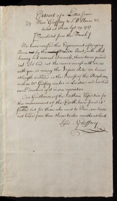 Claude Joseph Geoffroy, Extract of a letter, from Monsieur Geoffroy [Claude Joseph] to Hans Sloane, dated at Paris, 01 January 1737, EL/G2/34, The Royal Society Archives, London, https://makingscience.royalsociety.org/items/el_g2_34/extract-of-a-letter-from-monsieur-geoffroy-claude-joseph-to-hans-sloane-dated-at-paris, accessed on 12 January 2026