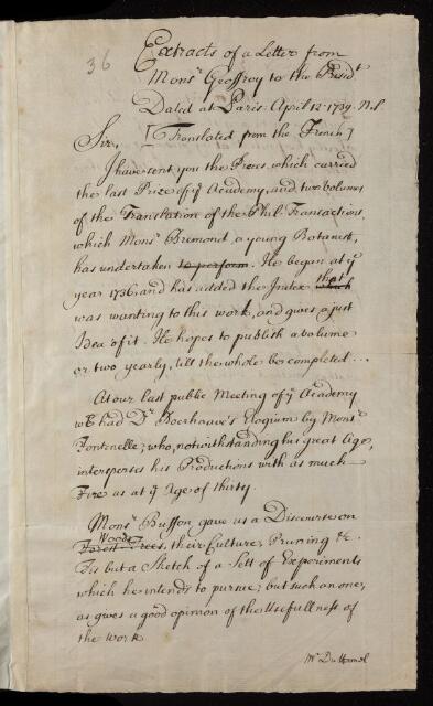 Claude Joseph Geoffroy, Extract of a letter, from Monsieur [Claude Joseph] Geoffroy to Hans Sloane, dated at Paris, 01 January 1739, EL/G2/36, The Royal Society Archives, London, https://makingscience.royalsociety.org/items/el_g2_36/extract-of-a-letter-from-monsieur-claude-joseph-geoffroy-to-hans-sloane-dated-at-paris, accessed on 22 January 2026