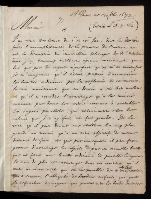 Christiaan Huygens, Christiaan Huygens, Letter, from Christian Huygens to Henry Oldenburg, dated at Paris, 13 February 1672, EL/H1/71, The Royal Society Archives, London, https://makingscience.royalsociety.org/items/el_h1_71/letter-from-christian-huygens-to-henry-oldenburg-dated-at-paris, accessed on 10 November 2025