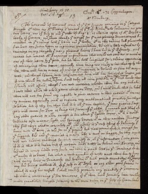 Thomas Henshaw, Thomas Henshaw, Letter, from Thomas Henshaw to Henry Oldenburg, dated at Copenhagen, 12 December 1672, EL/H3/13, The Royal Society Archives, London, https://makingscience.royalsociety.org/items/el_h3_13/letter-from-thomas-henshaw-to-henry-oldenburg-dated-at-copenhagen, accessed on 11 February 2026