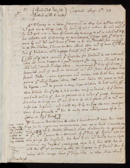 Thomas Henshaw, Thomas Henshaw, Letter, from Thomas Henshaw to Henry Oldenburg, dated at Copenhagen, 09 August 1673, EL/H3/15, The Royal Society Archives, London, https://makingscience.royalsociety.org/items/el_h3_15/letter-from-thomas-henshaw-to-henry-oldenburg-dated-at-copenhagen, accessed on 09 February 2026