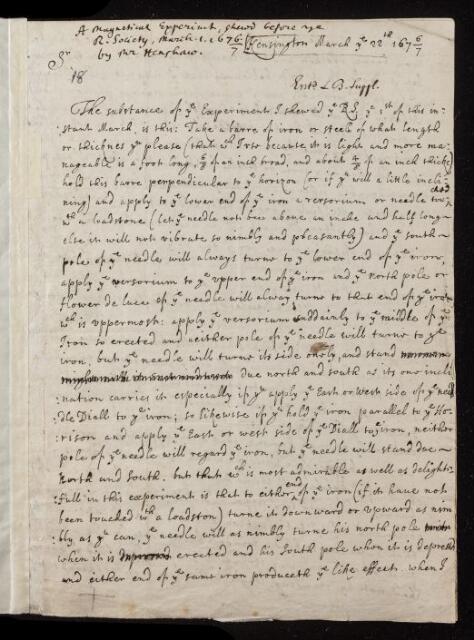 Details of an experiment with a lodestone and iron bar, which was carried out at the Royal Society on 1 March