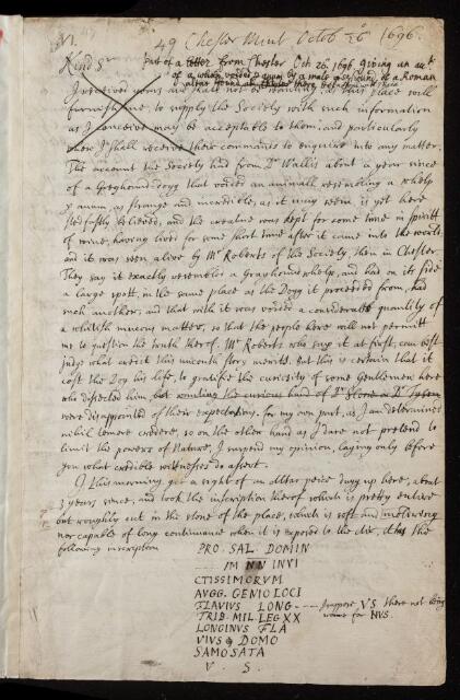 Stating that the information about a male greyhound voiding another animal, which looked like a whelp, was true; concerning the Roman altar piece dug up three years previously with its Latin inscription given; concerning the masonry of the buildings in Chester
