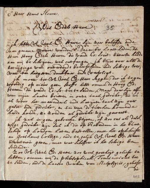 Letter, from Antoni van Leeuwenhoek to Hans Sloane