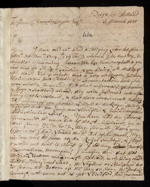 Letter, from Antoni van Leeuwenhoek to John Chamberlayne, dated at Delft