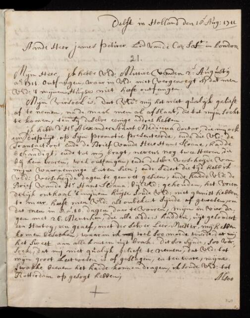 Letter, from Antoni van Leeuwenhoek to James Petiver, dated at Delft