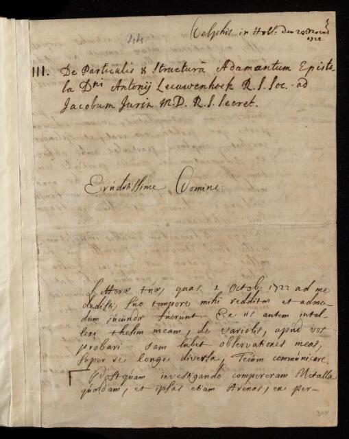 Antoni van Leeuwenhoek, Letter, from Antoni van Leeuwenhoek to James Jurin, dated at Delft, 20 November 1722, EL/L4/83, The Royal Society Archives, London, https://makingscience.royalsociety.org/items/el_l4_83/letter-from-antoni-van-leeuwenhoek-to-james-jurin-dated-at-delft, accessed on 07 February 2026