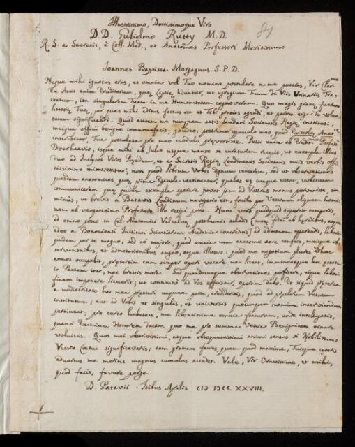Giambattista Morgagni, Gianbattista Morgagni, Letter, from John Baptist Morgagni to William Rutty, dated at Passau, 01 January 1727, EL/M2/81, The Royal Society Archives, London, https://makingscience.royalsociety.org/items/el_m2_81/letter-from-john-baptist-morgagni-to-william-rutty-dated-at-passau, accessed on 08 February 2026