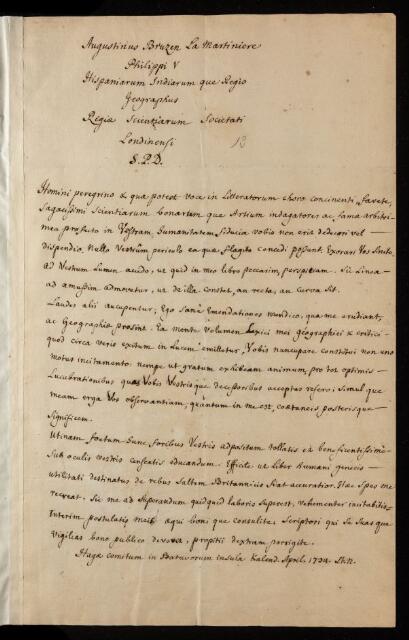 Letter, from Augustin Bruzen la Martiniere to the Royal Society