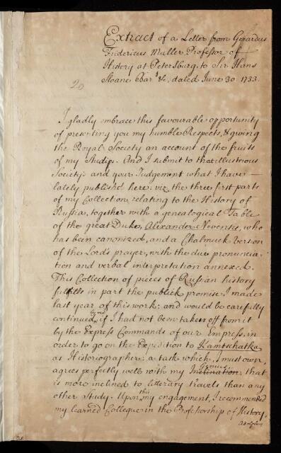 Gerhard Friedrich Muller, Extract of a letter, from Gerardus Fridericus Muller [Gerhard Friedrich Muller] to Hans Sloane, 30 June 1733, EL/M3/20, The Royal Society Archives, London, https://makingscience.royalsociety.org/items/el_m3_20/extract-of-a-letter-from-gerardus-fridericus-muller-gerhard-friedrich-muller-to-hans-sloane, accessed on 11 April 2026