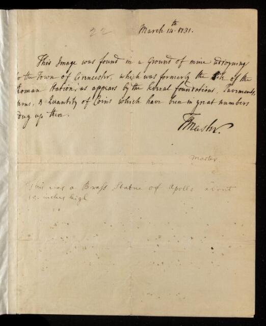 J. Master, Note on a brass statue found at a Roman site by Mr J. Master, 14 March 1733, EL/M3/22, The Royal Society Archives, London, https://makingscience.royalsociety.org/items/el_m3_22/note-on-a-brass-statue-found-at-a-roman-site-by-mr-j-master, accessed on 19 April 2026