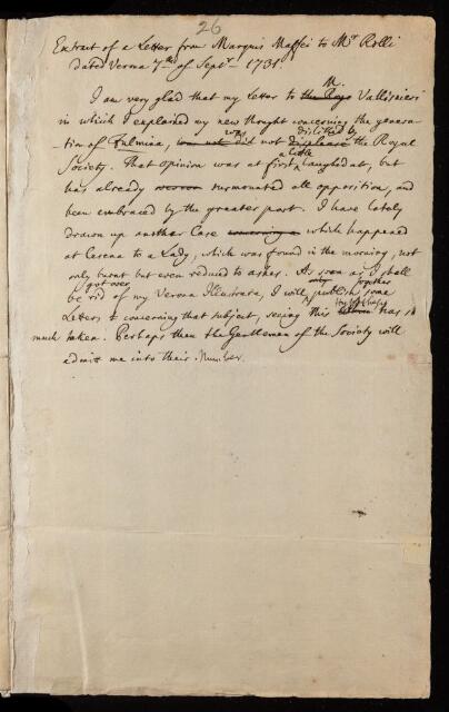 Extract of a letter, from Massei to Mr [Paolo] Rolli, 07 September 1731, EL/M3/26, The Royal Society Archives, London, https://makingscience.royalsociety.org/items/el_m3_26/extract-of-a-letter-from-massei-to-mr-paolo-rolli, accessed on 08 November 2025