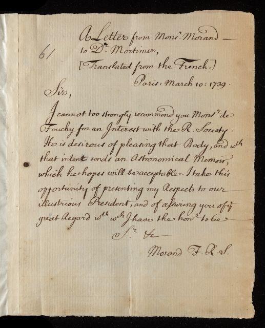 Sauveur Francois Morand, Sauveur-Francois Morand, Translation of a letter, from Monsieur Morand to Cromwell Mortimer, dated at Paris, 01 January 1739, EL/M3/61, The Royal Society Archives, London, https://makingscience.royalsociety.org/items/el_m3_61/translation-of-a-letter-from-monsieur-morand-to-cromwell-mortimer-dated-at-paris, accessed on 12 December 2025