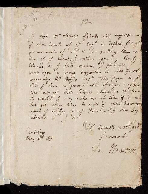 Isaac Newton, Sir; Isaac Newton, Letter, from Isaac Newton to Henry Oldenburg, dated at Cambridge, 11 May 1676, EL/N1/52, The Royal Society Archives, London, https://makingscience.royalsociety.org/items/el_n1_52/letter-from-isaac-newton-to-henry-oldenburg-dated-at-cambridge, accessed on 08 March 2026