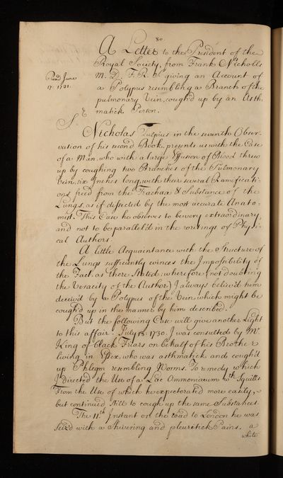 Account of a polypus resembling a branch of a pulmonary vein coughed up by an asthmatic person by Frank Nicholls