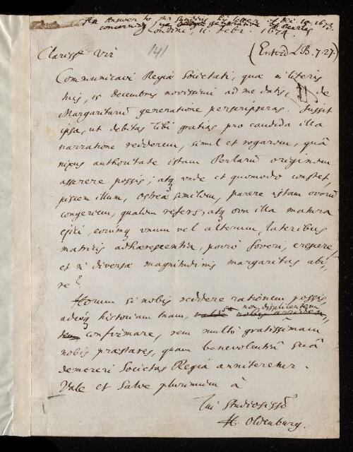 Henry Oldenburg, Letter, from Henry Oldenburg to Mr [Christoph] Sand, dated at London, 11 February 1674, EL/O2/141, The Royal Society Archives, London, https://makingscience.royalsociety.org/items/el_o2_141/letter-from-henry-oldenburg-to-mr-christoph-sand-dated-at-london, accessed on 07 December 2025