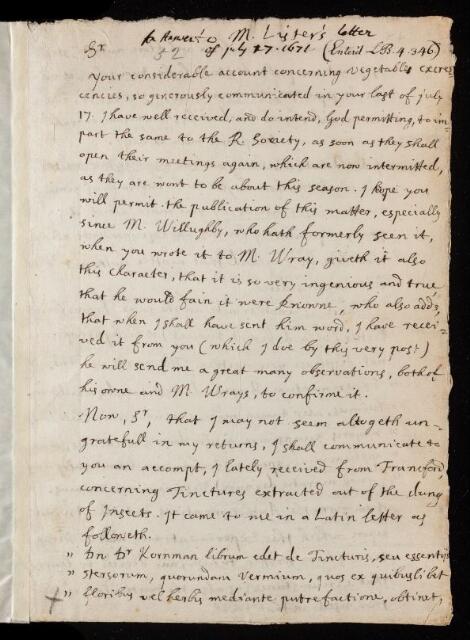 Henry Oldenburg, Letter, from Henry Oldenburg to Martin Lister, dated at London, 27 July 1671, EL/O2/52, The Royal Society Archives, London, https://makingscience.royalsociety.org/items/el_o2_52/letter-from-henry-oldenburg-to-martin-lister-dated-at-london, accessed on 12 December 2025