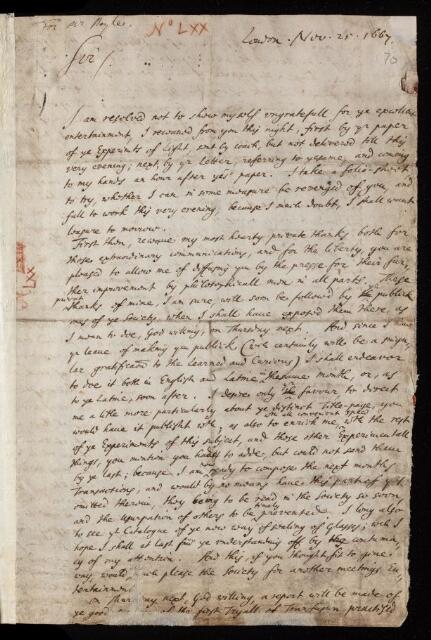 Henry Oldenburg, Letter, from Henry Oldenburg to Robert Boyle, dated at London, 25 November 1667, EL/OB/70, The Royal Society Archives, London, https://makingscience.royalsociety.org/items/el_ob_70/letter-from-henry-oldenburg-to-robert-boyle-dated-at-london, accessed on 12 January 2026