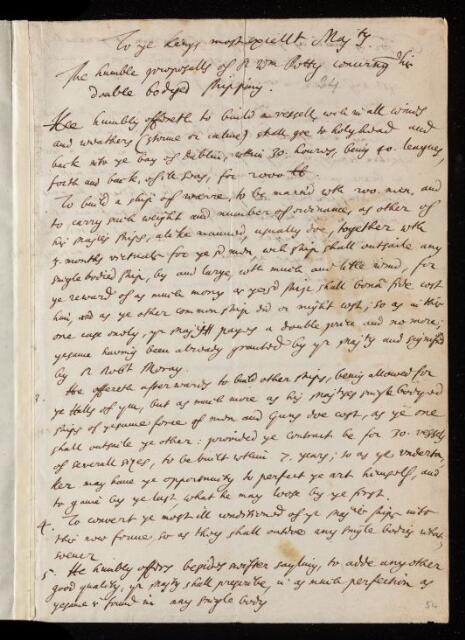 William Petty, Paper, 'The humble proposals of Sir William Petty concerning his double bodyed shipping' by William Petty to King Charles II, EL/P1/34, The Royal Society Archives, London, https://makingscience.royalsociety.org/items/el_p1_34/paper-the-humble-proposals-of-sir-william-petty-concerning-his-double-bodyed-shipping-by-william-petty-to-king-charles-ii, accessed on 13 March 2026