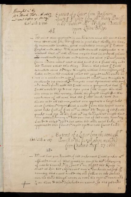 Letter originally dated 6 January 1665 - concerning a new star and about an earthquakes at Ballasore [sic. Balasore, Baleswar], India.