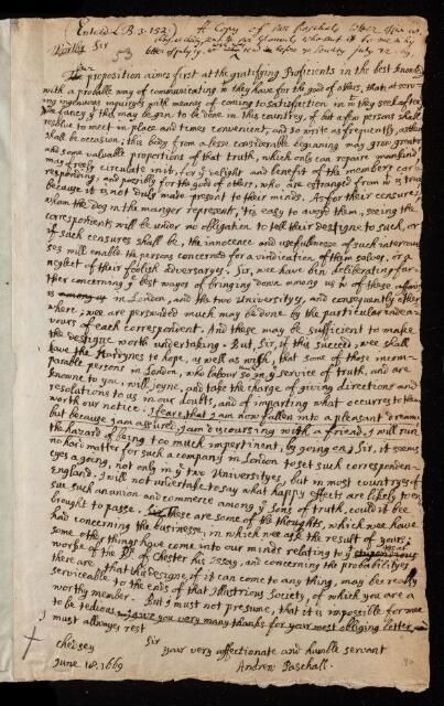 The archival collection known as 'Early Letters' is composed of original manuscript letters sent to, or collected by, the Royal Society from English and foreign correspondents.