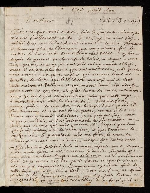 Ignace-Gaston Pardies, Letter, from Ignatius Pardies to Henry Oldenburg, dated at Paris, 09 July 1672, EL/P1/81, The Royal Society Archives, London, https://makingscience.royalsociety.org/items/el_p1_81/letter-from-ignatius-pardies-to-henry-oldenburg-dated-at-paris, accessed on 17 December 2025