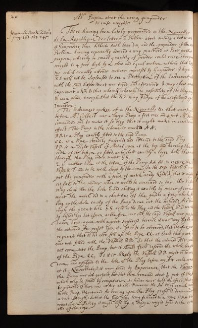 Denis Papin, Paper, 'On a machine to raise weights by gunpowder' by Denis Papin, 1688, EL/P1/88, The Royal Society Archives, London, https://makingscience.royalsociety.org/items/el_p1_88/paper-on-a-machine-to-raise-weights-by-gunpowder-by-denis-papin, accessed on 12 November 2025